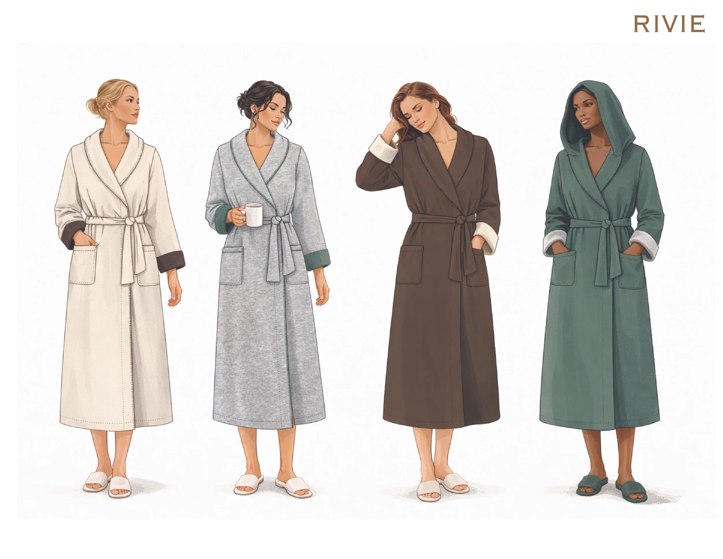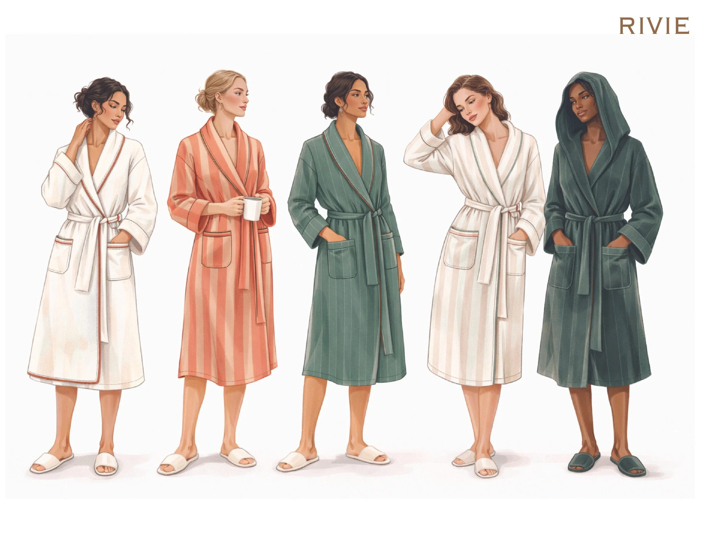 A refined take on everyday ritual, this collection draws inspiration from sun-washed coastlines and the quiet elegance of resort living. Soft, textured robes in earthy, mineral tones evoke the feeling of slow mornings by the sea—where comfort meets understated sophistication. Thoughtfully designed with relaxed silhouettes, subtle striping, and tonal contrasts, each piece is made to move effortlessly between home, spa, and travel.